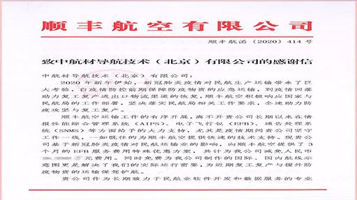 近日,中航材導(dǎo)航技術(shù)公司(以下簡(jiǎn)稱“中導(dǎo)航公司”)收到了一封來(lái)自客戶順豐航空有限公司(以下簡(jiǎn)稱“順豐航空”)的感謝信,對(duì)疫情期間中導(dǎo)航公司給予順豐航空運(yùn)輸工作有序開(kāi)展的大力支持表示感謝。